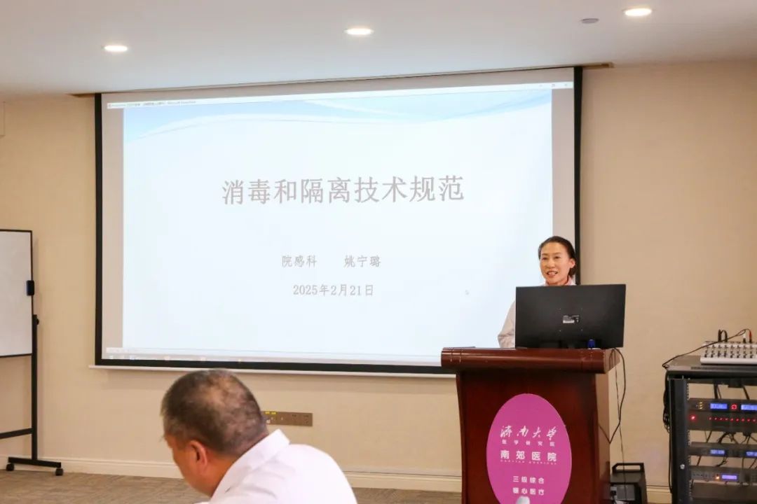 随后,济南南郊医院院感科姚宁璐主任以《消毒和隔离技术规范》为主题,为参训人员带来了一场精彩纷呈的专题培训。姚主任从消毒隔离管理制度、消毒灭菌基本原则、隔离标准操作规程、标准预防措施以及医务人员个人防护用品的使用等多个方面进行了深入细致的讲解。