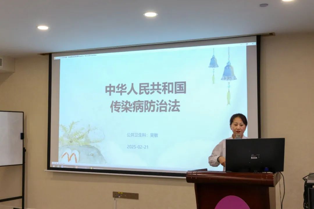 紧接着,公共卫生科吴敏主任以《中华人民共和国传染病防治法》为主题,为参训人员带来了一场深入浅出的专题培训。吴主任从传染病概述、法律法规框架与解读、传染病预防控制措施与策略以及传染病上报要求、报告卡及登记本的填写等多个方面进行了全面系统的讲解。