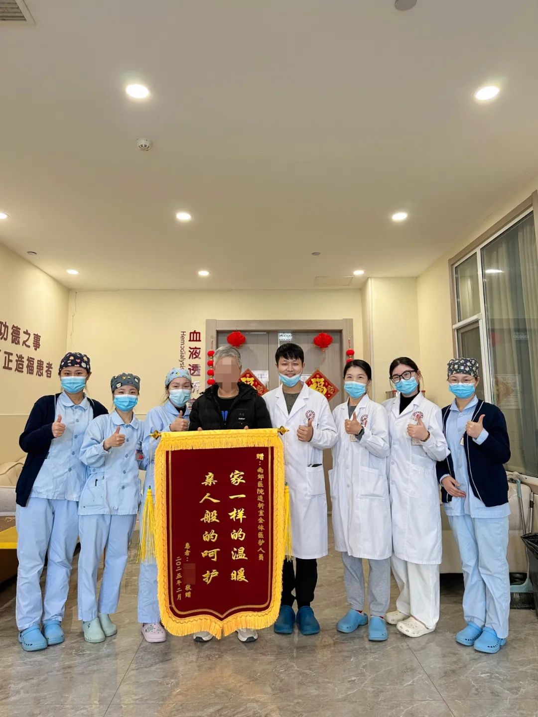正是这份“人本位”的关怀,让这位透析患者逐渐走出了困境。他的身体状况和精神面貌都有了显著改善,脸上重新洋溢起了笑容。他深知,这份改变离不开透析室医护人员的辛勤付出和无私奉献。因此,他特地制作了这面锦旗,以表达对他们的感激之情。