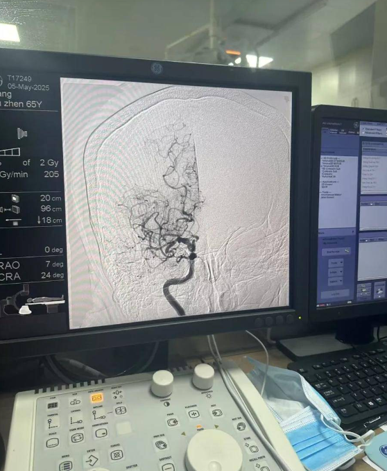 手术室内,气氛紧张到了极点。郭晓宾主任全神贯注,手持导管,在血管中小心翼翼地操作,每一个动作都关乎患者的安危。陈安平主治医师紧盯屏幕,密切关注患者生命体征和手术进展,随时准备应对突发状况。孟祥德主任在一旁不时给予指导和建议,凭借丰富的经验把控全局。