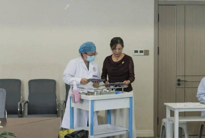 比赛现场,选手们严格遵循"三查八对"原则,从患者确认签字到实施人本位暖心服务,每一个步骤都严谨细致。他们熟练地演示消毒、穿刺、固定等操作流程,动作规范、轻柔,尽显技术娴熟。在操作过程中,选手们还特别注重与"病人"的沟通交流,耐心做好知情告知,详细解释操作目的、注意事项等,让"病人"感受到温暖和关怀,充分展示了良好的沟通技巧和人文关怀精神。