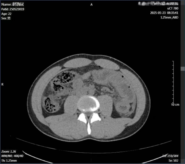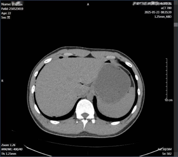 23号凌晨,一场车祸中的重伤者送到了济南南郊医院。伤者是一名22岁的小伙子,因为多发伤,被送到南郊医院的神经外科,腹部CT检查未见外伤改变。在神经外科初步处理了脑震荡、头皮裂伤、腰椎骨折、左膝部挫裂伤和左股外侧肌腱膜破裂等外伤后,伤者在几小时后突发剧烈的腹部疼痛,随即被转至普外科进行紧急处理。