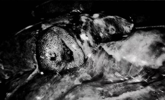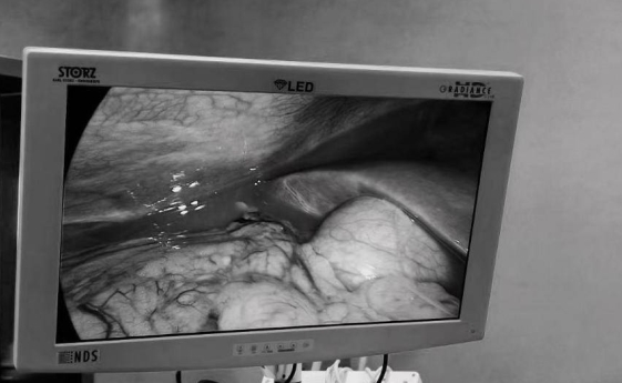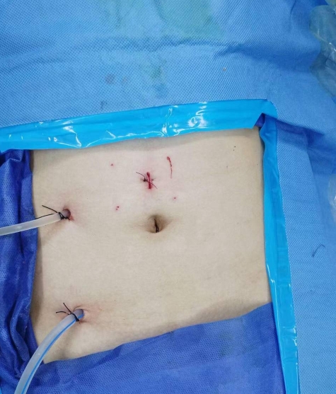 术中探查,腹腔大量浑浊液体约1000ml,重度感染,距离屈氏韧带约35cm处空肠见直径约1.5cm的穿孔,肠液及食物残渣不断渗出,另见部分小肠浆膜及左半结肠浆膜及脂肪垂挫伤。给予肠壁修补,大量生理盐水冲洗。手术过程中出血仅10ml。腹壁只有三个小孔,微创手术解决病人创伤难题。