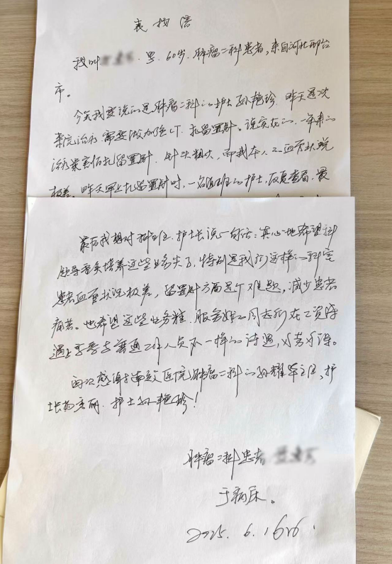 患者在信中详细描述了他在住院期间所感受到的温暖和专业护理,特别提到了护士孙艳珍如何耐心地解答他每一个问题,如何在他感到不适时及时给予帮助,以及如何在日常护理中展现出的细心和关怀。他还对孙耀华主任的专业能力表示了高度赞扬,感谢他在治疗方案的制定和病情解释上给予的明确指导和专业建议。此外,患者也对护士长杨秀丽的领导和关怀表示了感谢,他提到护士长不仅在工作上严谨负责,还在心理上给予患者极大的支持和鼓励,让患者在面对疾病时更加坚强和乐观。