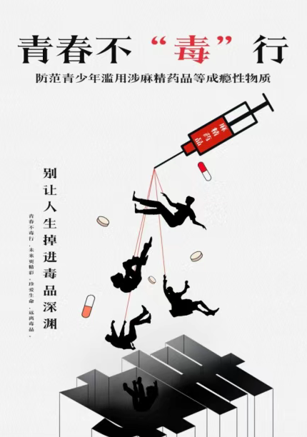 再看这张“青春不‘毒’行” 的海报,被麻精药品 “注射器” 拽向深渊的身影,多像被成瘾性物质吞噬的人生。一旦沾染,身体成瘾、精神失控,暴力与死亡的阴影笼罩,违法犯罪的歧途也在招手。