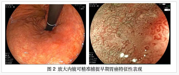 早期胃癌特征识别:早期胃癌的微小病变(如不规则腺管排列、血管迂曲或消失)可通过放大内镜发现,而普通内镜容易漏诊。