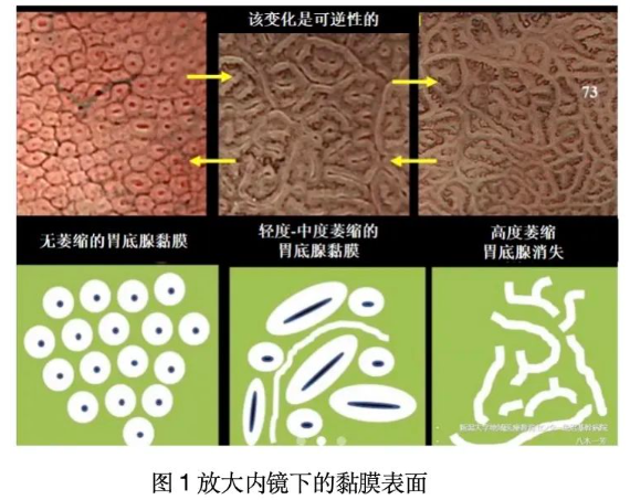 黏膜表面结构破坏:腺体排列紊乱或消失。