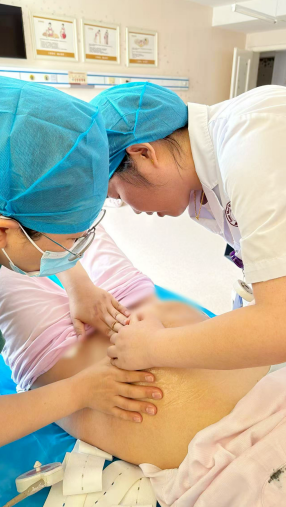 这位37 周的济南一胎宝妈,顺产是她的首选,无奈的是几次B超都显示宝宝一直在“打坐”。因此,她慕名找到济南南郊医院产科范桂芬主任。范主任先对宝妈进行全面评估,包括胎儿大小、羊水量、胎盘位置以及宝妈的骨盆条件等,确保符合外倒转术的条件。随后,在产房张喜燕护士长的现场配合与严密胎心监测下,经过范主任的专业操作,胎儿成功转为头位,为宝妈后续顺产奠定了基础。