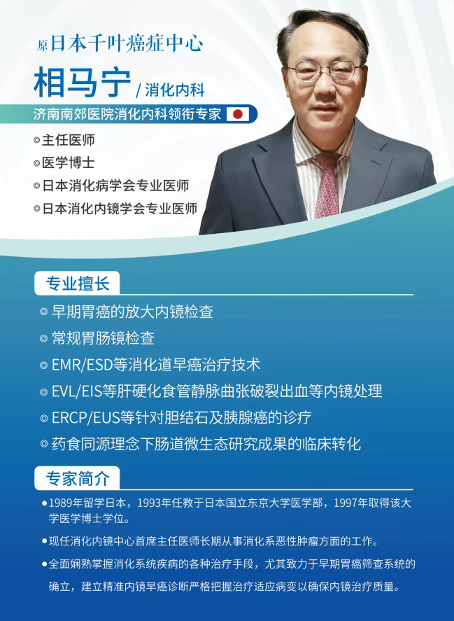 相马宁教授作为日本消化内镜领域知名专家,以融合日式精细化操作与国内需求的全面诊疗体系,提供国际标准的技术保障和全流程贴心的服务保障。无论是反复腹痛、便血,还是体检发现可疑病变,济南南郊医院消化内镜中心都能提供一站式解决方案,让您早一步守护胃肠健康。