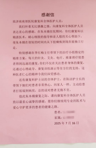 这场康复奇迹,是李红梅主任和她的医疗团队“有时去治愈,常常去帮助,总是去安慰”的生动注脚。他们不仅修复身体机能,更用陪伴与鼓励点亮患者心灯,让朱女士从心情低落走向开朗,重拾对生活的热忱。患者康复后写下感谢信,既是对康复科全体医护精湛医术、暖心照护的肯定,更见证了医患携手跨越困境的力量。