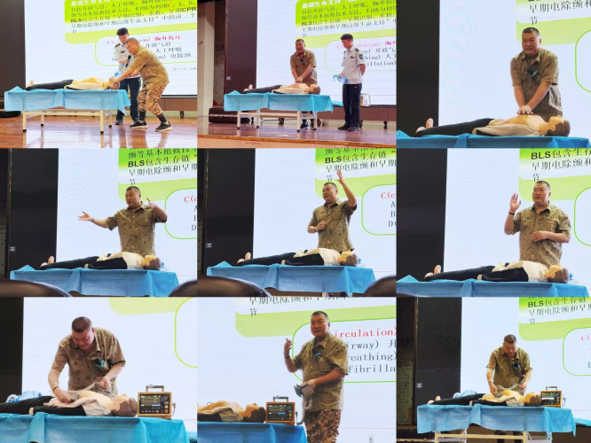 “胸外按压要快而深!频率100-120次/分钟,深度5-6厘米,掌根重叠、双臂伸直,用身体重量垂直下压!”教官一边示范,一边纠正不准确的动作,“按压与通气比例30:2,5个周期为一组,循环往复,直到专业救援人员抵达。”单人心肺复苏的训练中,汗湿衣衫,却始终紧盯模拟人的“生命体征”,不敢有丝毫懈怠。