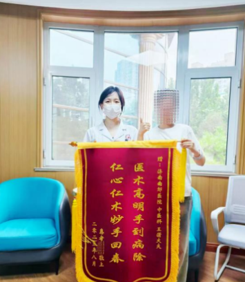 在济南南郊医院中医科,一面写着“医术高明手到病除,仁心仁术妙手回春”的锦旗格外引人注目,它承载着一位年轻女性患者对王潇医生深深的感激之情。
