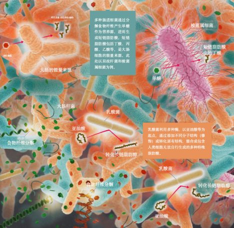 举例说明,这场“特殊消化” 的核心,是肠道细菌对水溶性膳食纤维的分解。它们通过代谢将膳食纤维转化为单糖,作为自身活动的能量来源;更关键的是,过程中会产生酪酸等短链脂肪酸(碳原子数 2~4)。这些物质堪称大肠细胞的 “能量宝库”,不仅为肠黏膜分泌黏液、吸收水分等基础功能提供动力,还能增强肠细胞间的连接,强化肠道屏障,有效抵御病原体入侵。