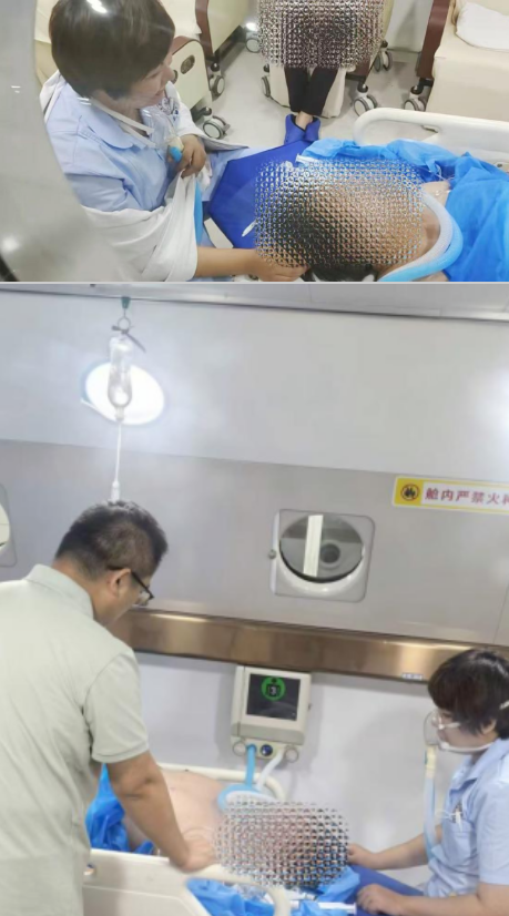 患者到达医院后,急诊科的医疗团队迅速而准确地进行了诊断,并立即将患者收治到重症监护室,并且康复医学中心的专家们也立即行动起来,为患者实施了高压氧治疗。ICU给予患者生命体征监护,氧疗,补液抗炎,营养脑神经,保护重要脏器功能对症支持治疗。崔海银院长亲自给患者放置尿管。组织人员急诊行高压氧舱治疗,并选派经验丰富的人员陪舱。这一及时的治疗措施为患者后续的康复过程打下了至关重要的基础。在治疗过程中,高压氧科的姜涵池技师、ICU的余主任以及康复医学中心的护士长陈洁,他们凭借自己在重症救治方面的丰富经验,全程监控患者的生命体征,并从康复护理、心理疏导等多个角度为患者提供了全面而专业的照护。同时,高压氧科的医护人员也密切监测治疗过程中的各种反应,确保治疗的安全性和有效性。