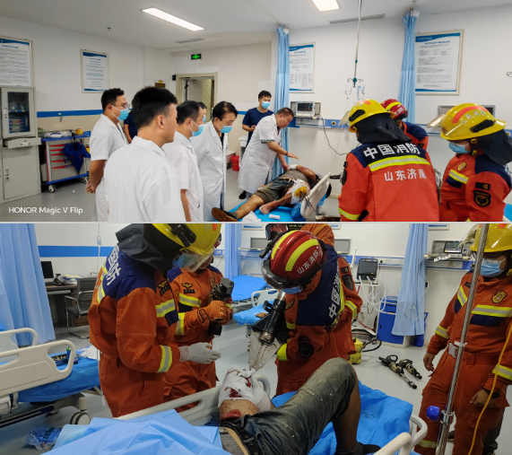 事故发生后,济南南郊医院接到急救电话,立即启动院前急救流程,急救团队火速奔赴现场,抵达后第一时间为患者输液、监测心电图、稳定生命体征,为后续抢救筑牢基础。转运途中,南郊医院同步开启多部门协同预案:一边联系消防部门,提前部署钢筋专业处置工作;一边崔海银院长上报市中区应急办、济南市应急办,市中区娄局、济南市应急办孙玉凯处长迅速介入,统筹协调各方资源,为救援打通“绿色通道”。