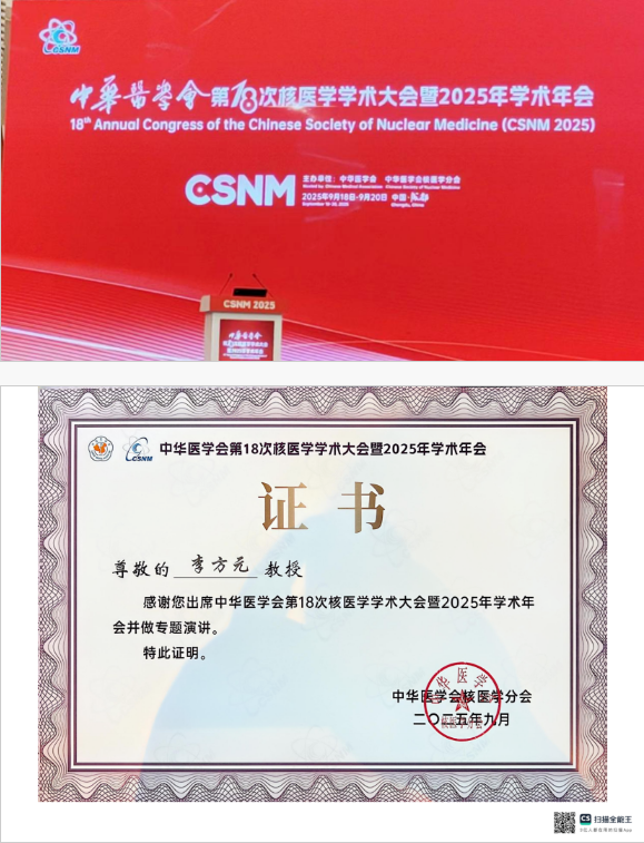 此次受邀在全国核医学年会上作专题报告,不仅体现了李方元主任本人在核医学领域深厚的学术造诣和丰富的临床经验,也充分展示了济南南郊医院放射与核医学科在临床科研和学术创新方面的实力。近年来,济南南郊医院放射与核医学科在李方元主任的带领下,不断加强学科建设,注重人才培养和科研创新,在影像诊断领域取得了显著成绩。