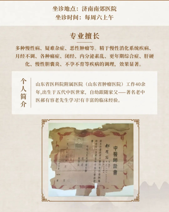 郝立源主任作为五代中医世家传承人,自幼随祖父、父亲研习中医经典,深得家族中医精髓。现任山东省中医药学会理事、济南市名老中医师承指导老师,从事中医临床工作近40年,具有深厚的中医理论功底和丰富的临床经验,尤其擅长运用传统中医方法诊治各类疑难杂症。