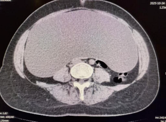 患者因发现腹腔内巨大占位性病变来到济南南郊医院就诊。术前的影像学检查结果令人震惊:腹腔内可见一范围约45cm×35cm×14cm的巨大囊性低密度影,几乎填满了整个腹腔空间,对周围脏器形成了明显的压迫。如此巨大的囊肿,不仅给患者带来了沉重的生理负担和心理压力,也对手术团队提出了极高的技术要求——如何在有限的操作空间内安全、完整地切除囊肿,同时避免损伤周围重要组织和血管,是摆在医生面前的首要难题。