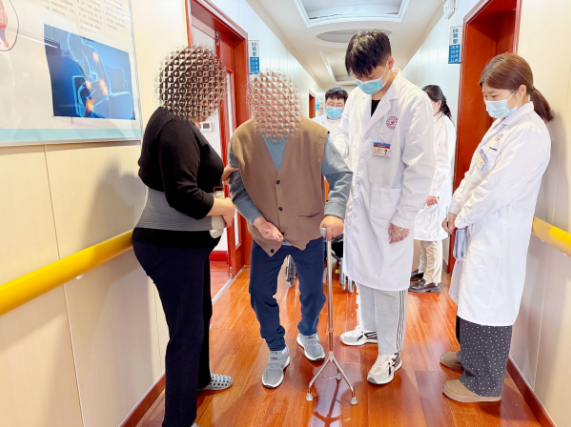 康复之路充满挑战,但医护人员以专业与耐心,从最初的器械辅助直立,到搀扶下行走,再到如今能够在拐杖辅助下独立行走一段距离;从完全失语到能够开口说话,从记忆理解停留在懵懂状态到能够背诵毛主席语录、高唱《东方红》片段——每一个微小的进步都凝聚着康复科医护人员和老人共同付出的无数汗水。更令人欣慰的是,老人展现出了积极乐观的精神面貌。这份对生活的热爱与坚持,感染着身边的每一个人。